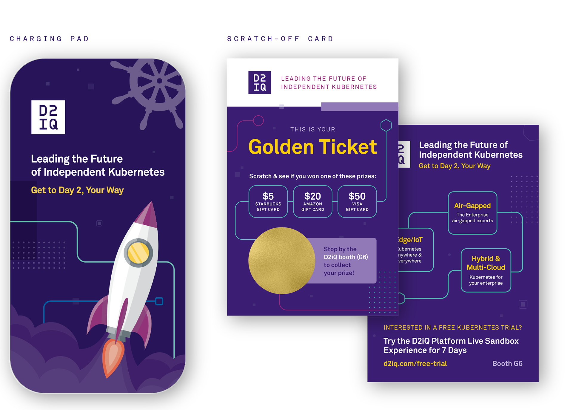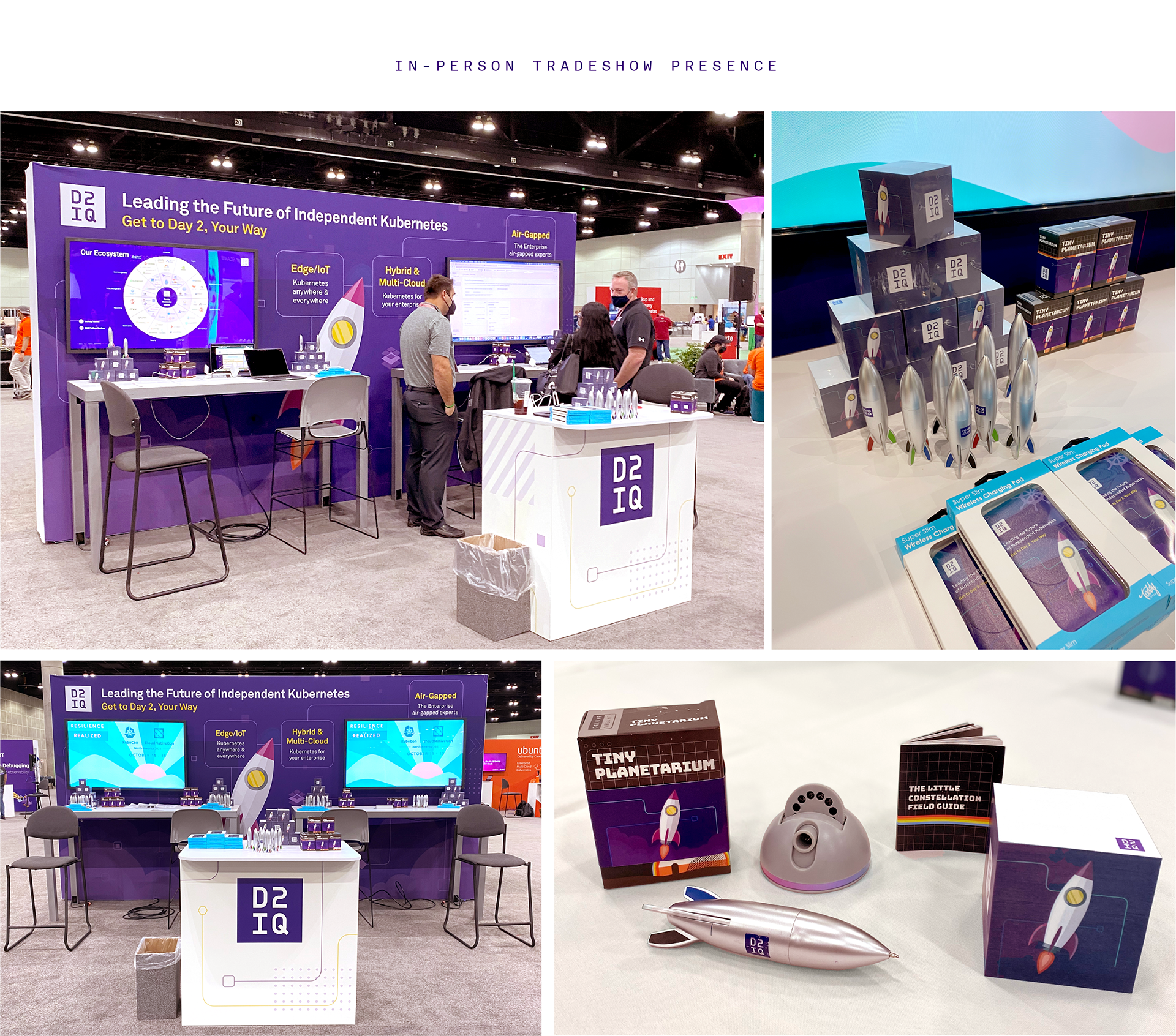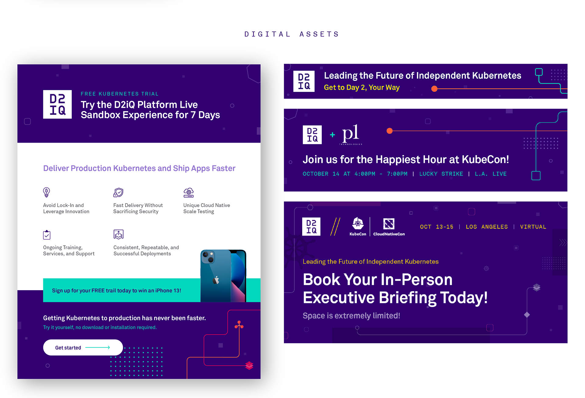For D2iQ's participation in the KubeCon conference, I came up with the overall look and feel and design elements, then applied them across deliverables such as the tradeshow booth, swag, virtual booth elements, digital assets and promotions.